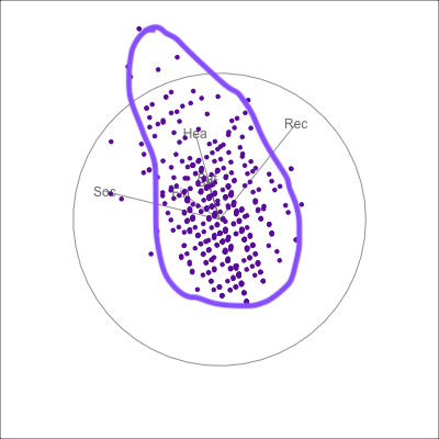 {fig-alt=“A single 2D projection of 6D data shown as a scatterplot of purple points. A purple sketch roughs out the shape, which is like a pear. The variables are mostly contributing to this projection Soc, Rec and Hea.”}