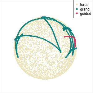The tourr package provides the algorithm to generate the tour paths, and also create new tours, different displays.